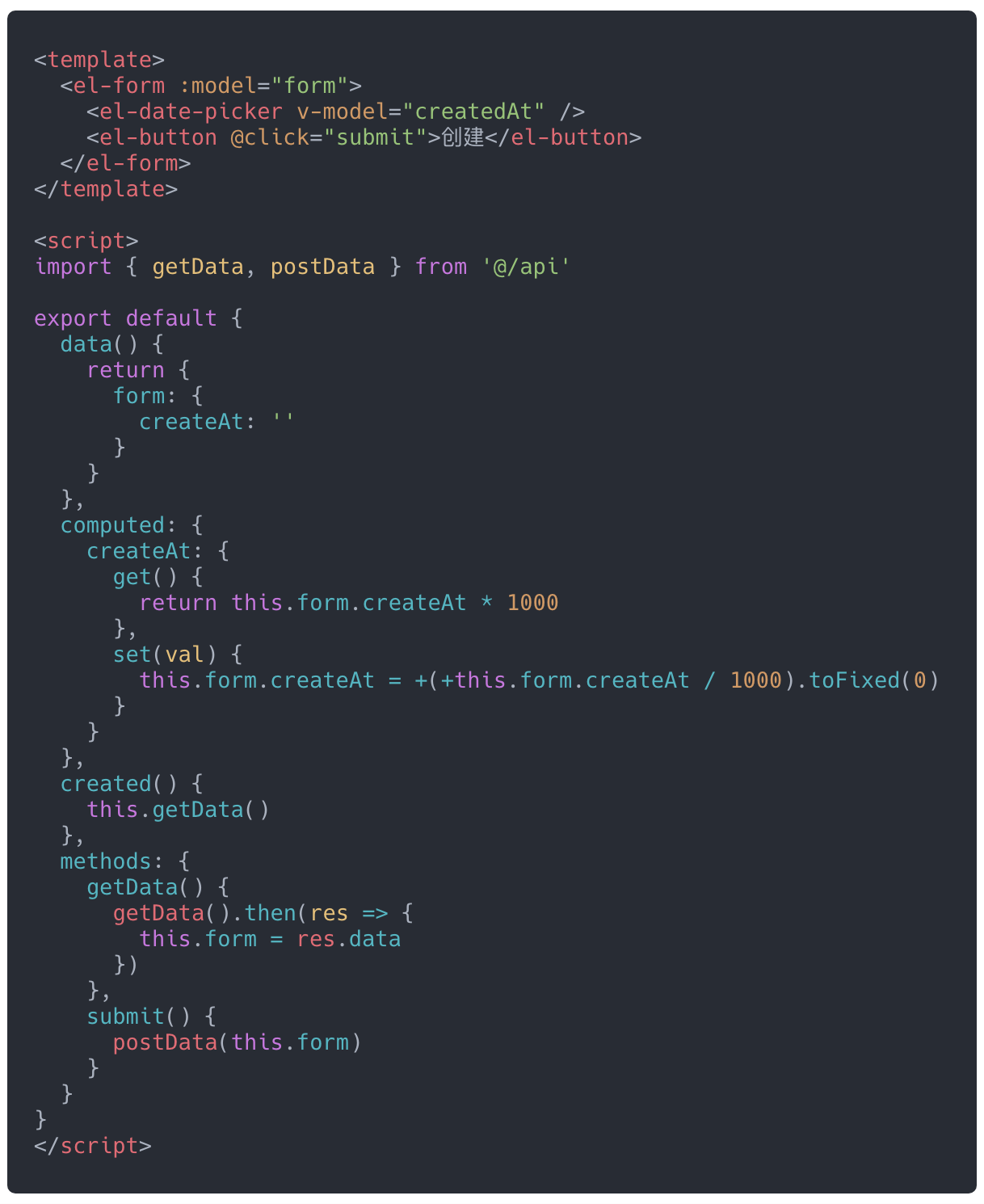 当然上面说的方案还不是最好的方案,你其实应该利用之前所说的v-bind="$attrs"和v-on="$listeners"对时间选择器组件进行二次封装。例如这样<date-time v-model="postForm.create_at" /> 外部无需做任何数据处理,直接传入一个 10 位的时间戳,内部进行转化。当日期发生变化的时候,自动通过emit触发input使v-model发生变化,把所有脏活累活都放在组件内部完成,保持外部业务代码的相对干净。具体 v-model 语法糖原理可以见官方 文档。
