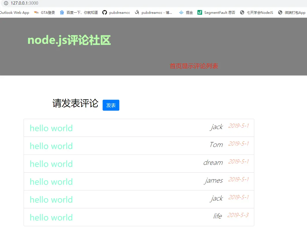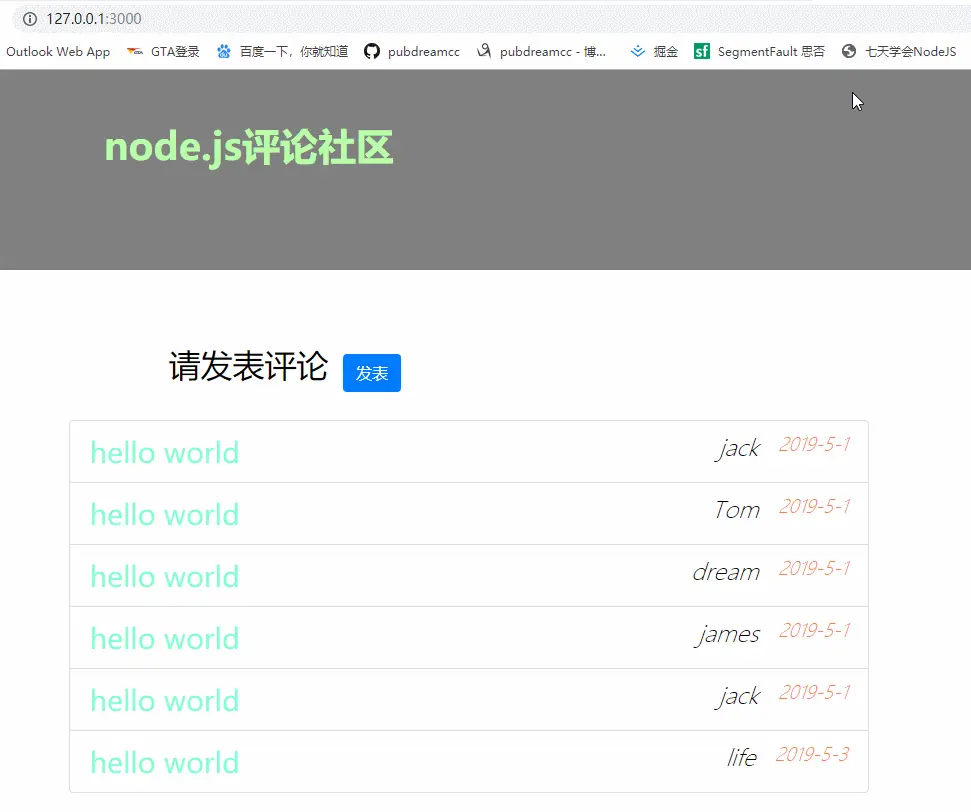 接着上一节的内容来,今天我们要完成一个用Node开发后台服务器,实现一个简单的用户评论社区。可以先看下效果图: