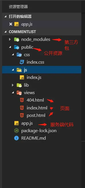 comment-list,在里面新建一个public文件夹,public文件夹存放我们允许客户端访问的资源,这里是公开的。app.js文件是我们服务端代码。