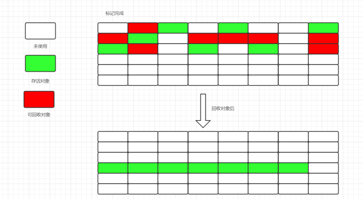 标记清除算法分为“标记”和“清除”两个阶段,首先先标记出那些对象需要被回收,在标记完成后会对这些被标记了的对象进行回收;如下图: