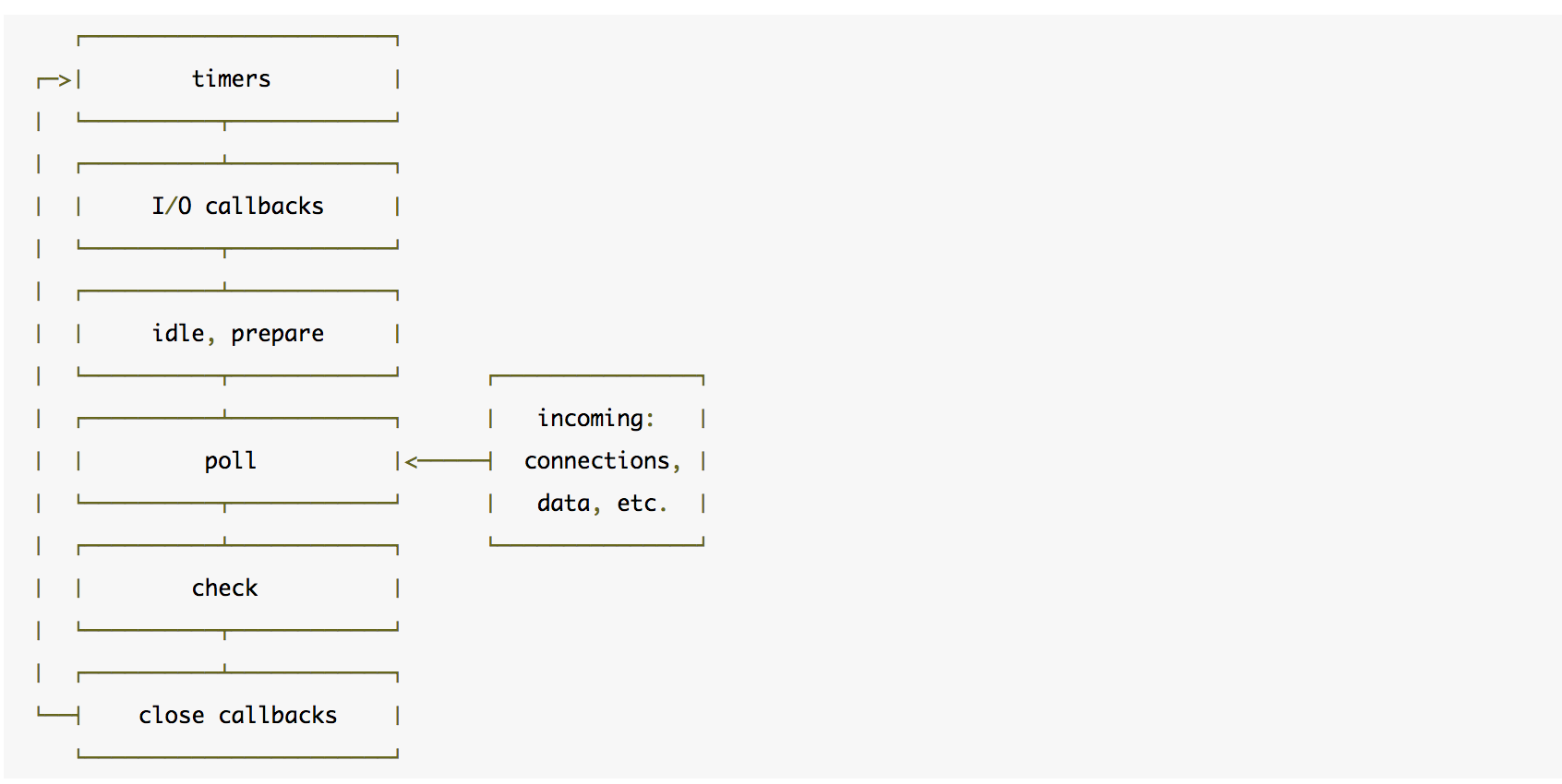 node.js 中的event loop 每一次循环都要执行这6个阶段。每个阶段都有自己的callback队列,每当进入某个阶段,都会从所属的队列中取出callback来执行,当队列为空或者被执行callback的数量达到系统的最大数量时候,进入下一阶段。这六个阶段都被执行完毕之后被称为一个循环。