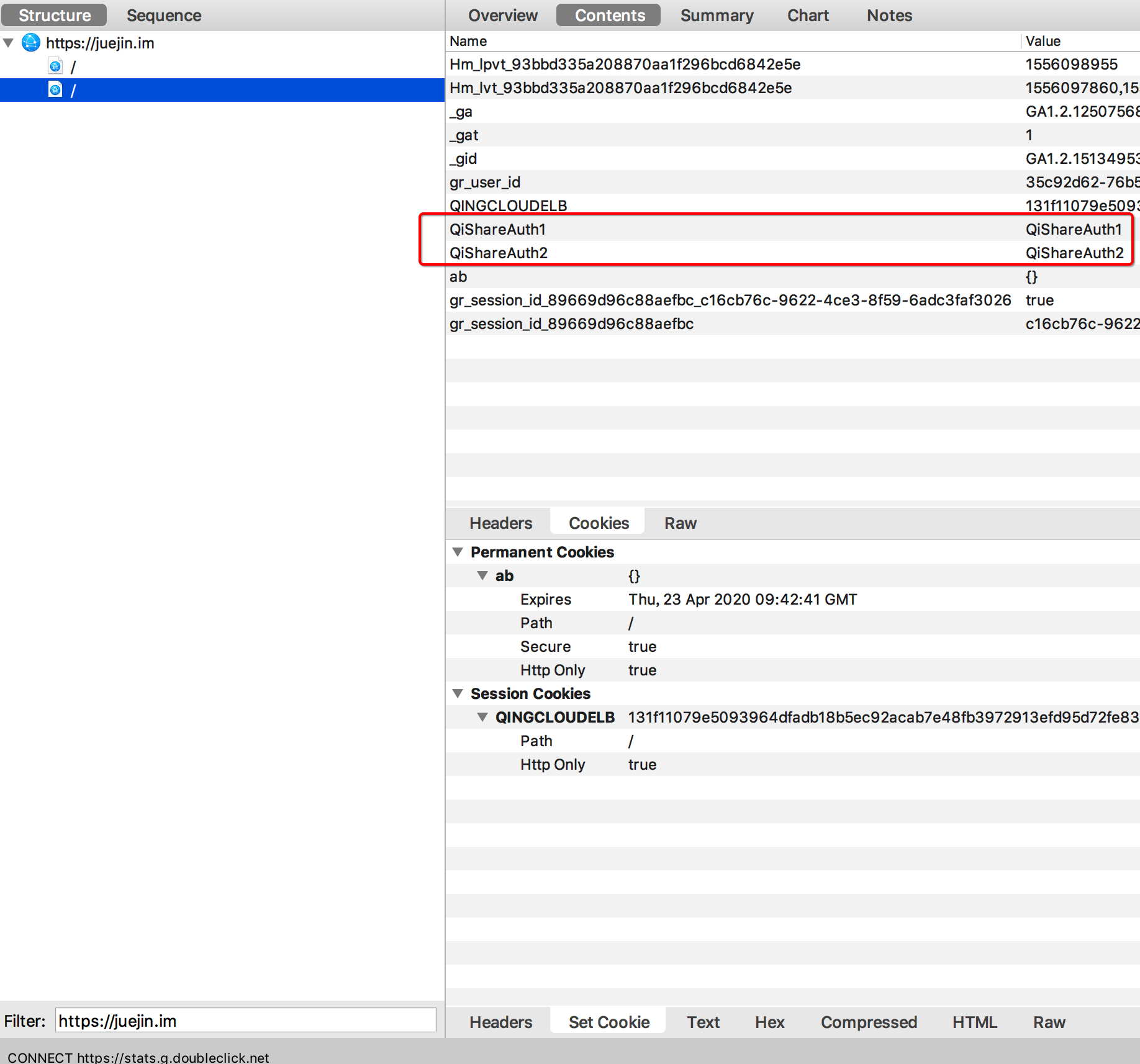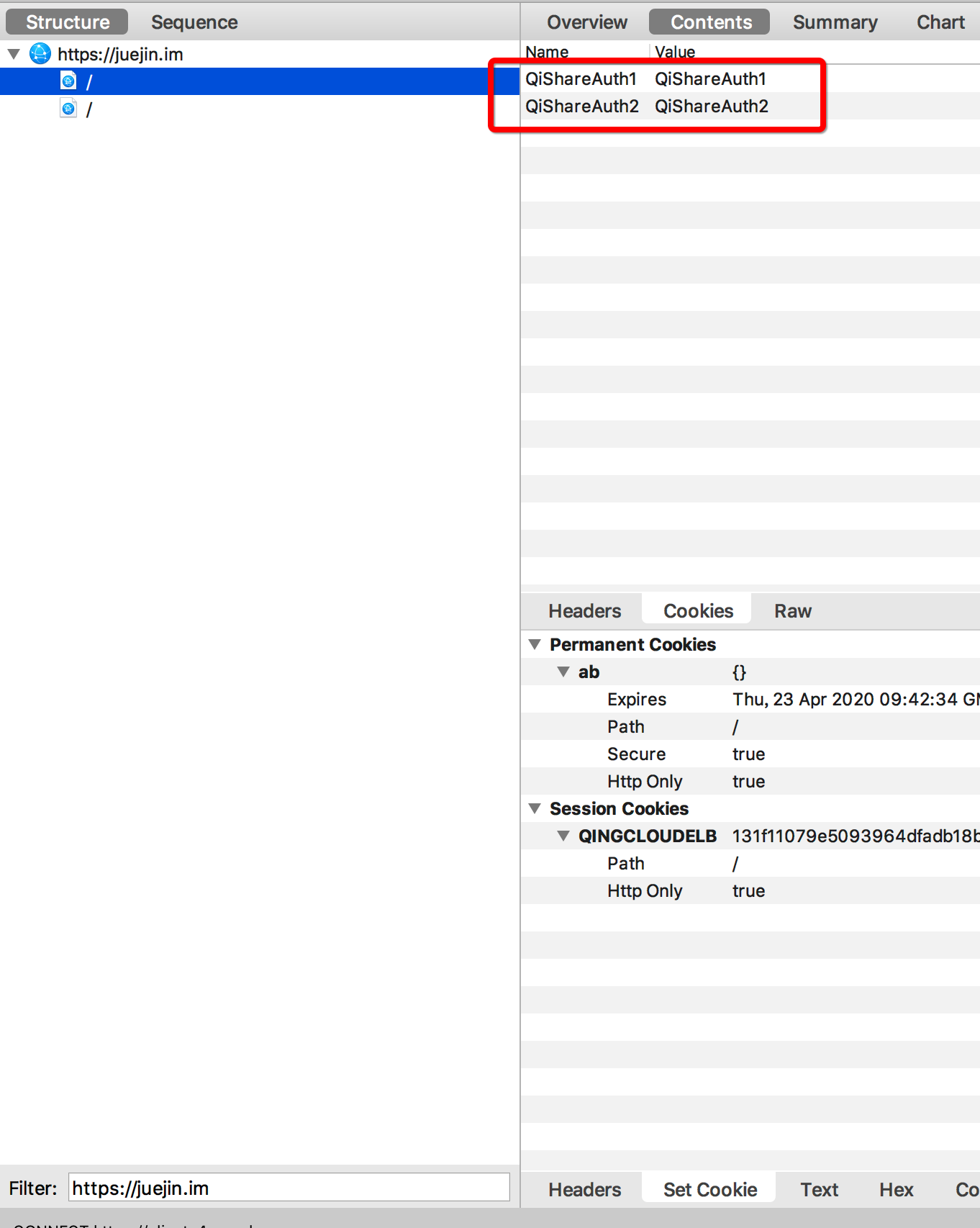 笔者以WKWebView加载掘金url,且加载过程中WKWebView注入Cookie,WKWebView设置如下Cookie(设置一个名为QiShareAuth1 值也为QiShareAuth1的Cookie;另外设置一个名为QiShareAuth2 值也为QiShareAuth2的Cookie)。 可以使用如下代码: