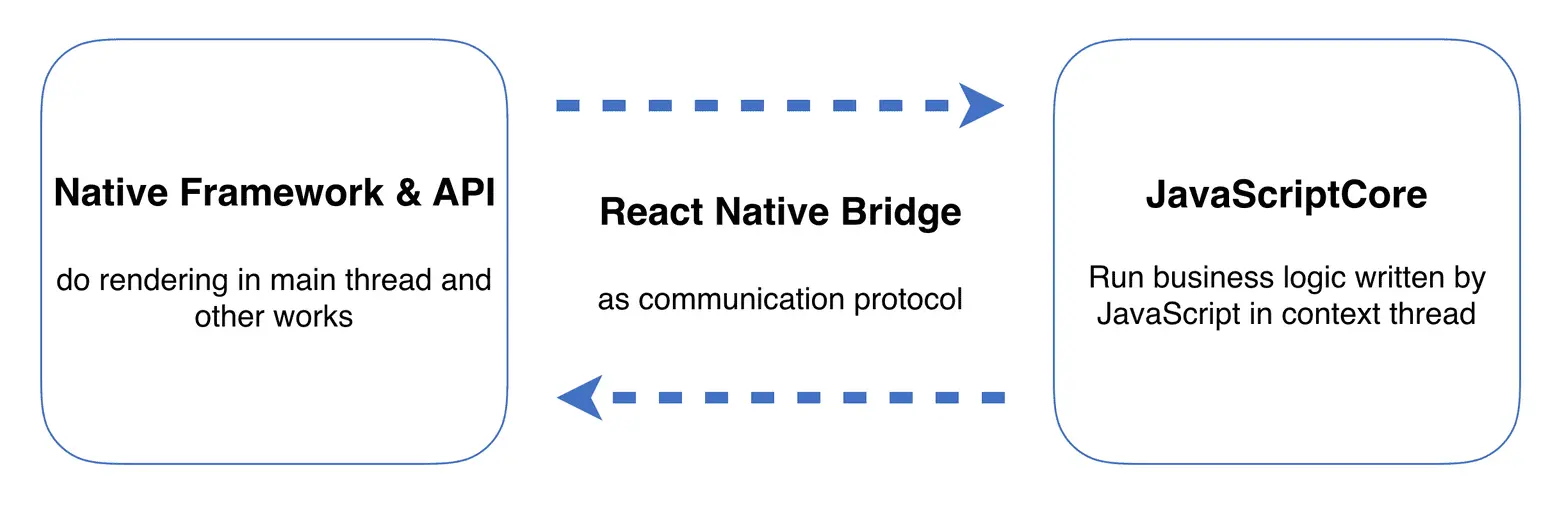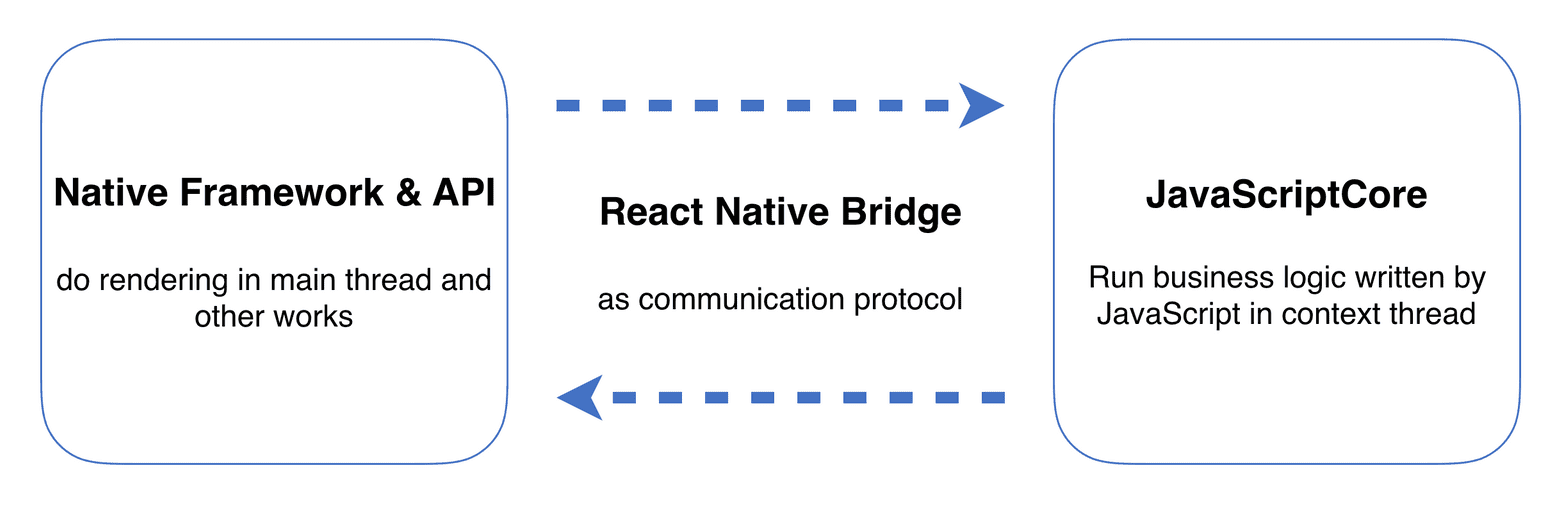 React Native 能做到这些的核心原理就是 JavaScriptCore,一个 JavaScript 虚拟机。通过 JavaScriptCore,Javascript 能和其它语言互相转义,同时 JavaScriptCore 能运行在 iOS,Android 以及其它平台上,这些可能性放在一起,就成为了 React Native 的基底。有了这个基底之后,Facebook 便在这个基础之上,封装了各平台的应用层接口,定义了 Javascript 和封装后的接口之间的通信协议,最终,实现了使用 JavaScript 在不同平台开发具有原生体验的应用。