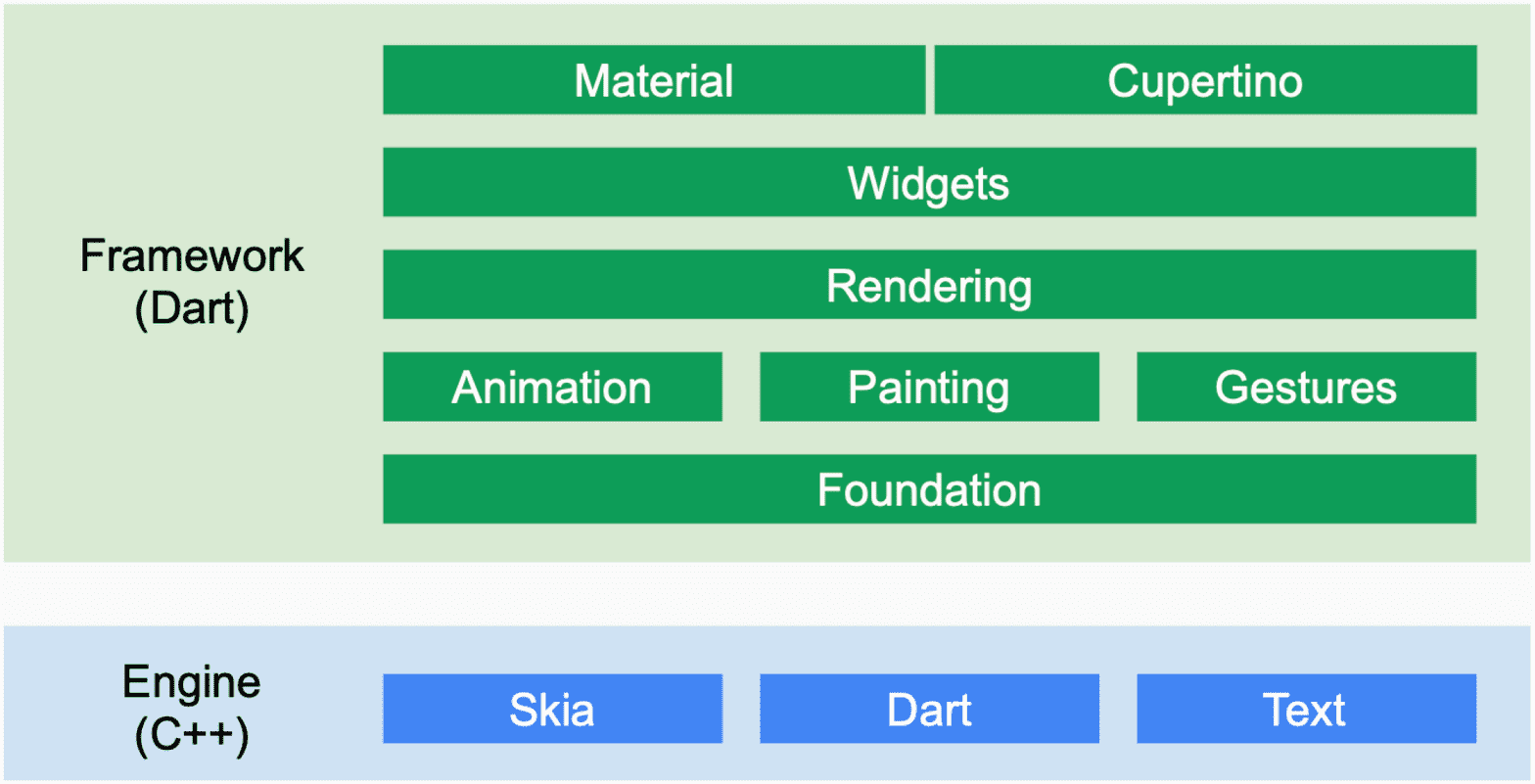 Flutter 使用 Dart 这门较为冷门的语言来做开发,底基引擎主要由 Skia 和 Dart runtime 构成。Flutter 通过 Skia 和各平台的底层图形库对接,同时提供丰富的基于 Skia 的控件,来实现跨平台的开发。React Native 采用的方式是封装各个平台的应用层接口,而 Flutter 则直接打造了一套跨平台的应用层的开发套件。对这两种不同的方式,我们可以有一个直觉上的判断,Flutter 在性能上是要优于 React Native 的。因为 Flutter 的这种实现方式,其实早已被大量并广泛的使用了,最明显的例子就是游戏引擎。