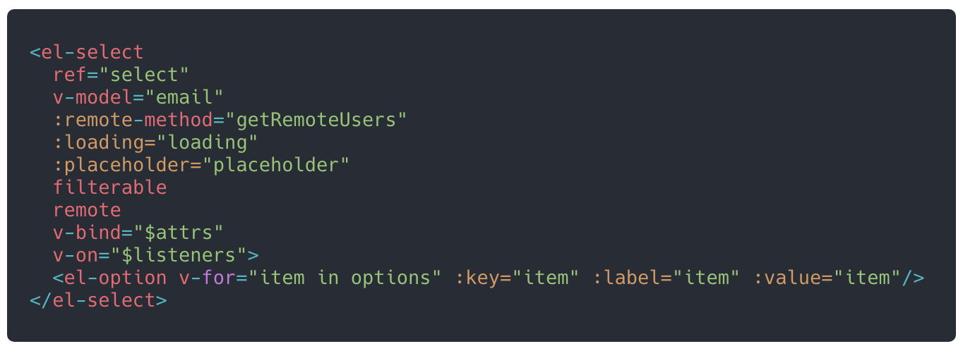 其实我们的这个组件只是基于el-select做了一些业务的封装,比如添加了默认的placeholder,封装了远程 ajax 搜索请求等等,总的来说它就是一个中间人组件,只负责传递数据而已。