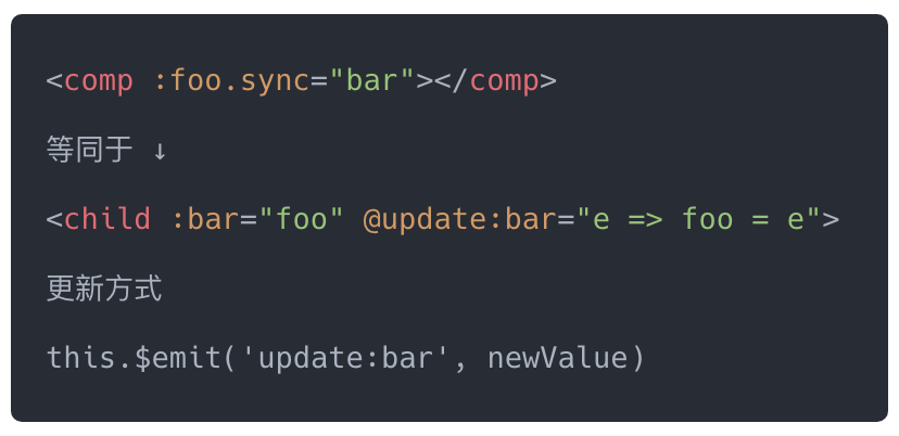这个也是 vue 2.3 之后新加的一个语法糖。这也是平时在分装组件的时候很好用的一个语法糖,它的实现机制和v-model是一样的。