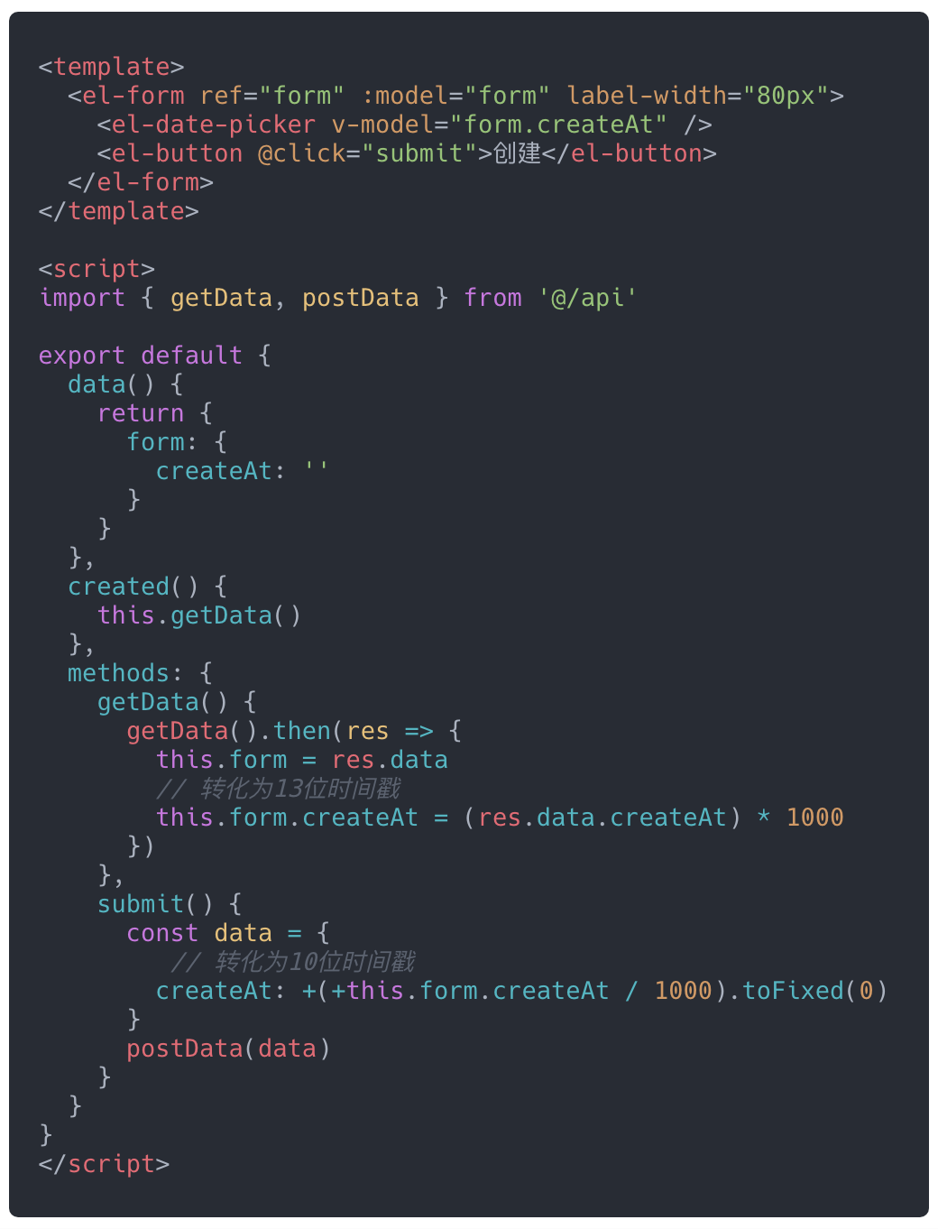 上面说的可能还是是有点抽象,举一个简单的的例子:我们有一个 form 表单,from 里面有一个记录创建时间的字段create_at。我们知道前端的时间戳都是 13 位的,但很多后端默认时间戳是 10 位的,这就很蛋疼了。前端和后端的时间戳位数不一致。最常见的做法如下: