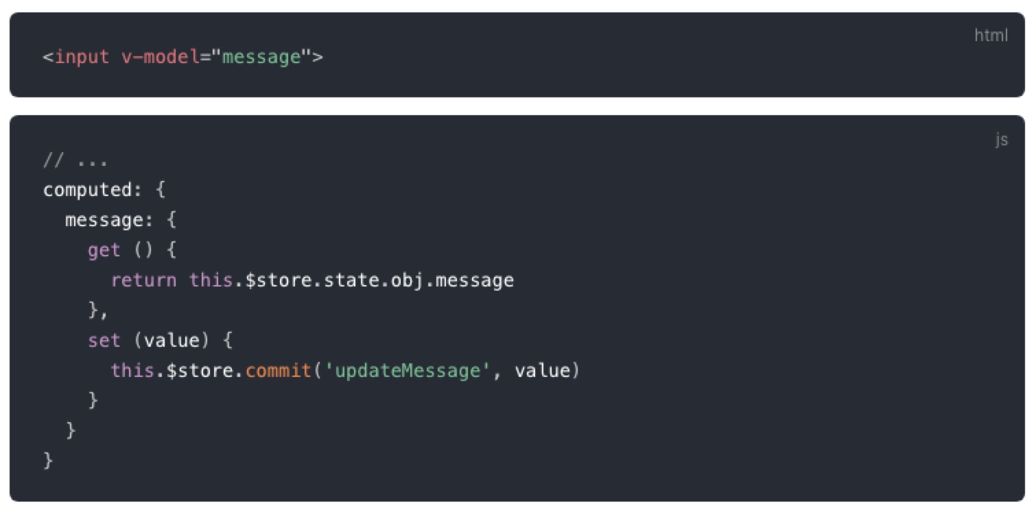 set 和 get 处理可以做上面说的进行一些数据处理之外,你也可以把它当做一个 watch的升级版。它可以监听数据的变化,当发生变化时,做一些额外的操作。最经典的用法就是v-model上绑定一个 vuex 值的时候,input 发生变化时,通过 commit更新存在 vuex 里面的值。