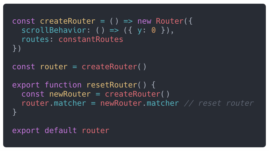 它的原理其实很简单,所有的 vue-router 注册的路由信息都是存放在matcher之中的,所以当我们想清空路由的时候,我们只要新建一个空的Router实例,将它的matcher重新赋值给我们之前定义的路由就可以了。巧妙的实现了动态路由的清除。 现在我们只需要调用resetRouter,就能得到一个空的路有实例,之后你就可以重新addRoutes你想要的路由了。完整的代码实例