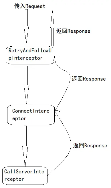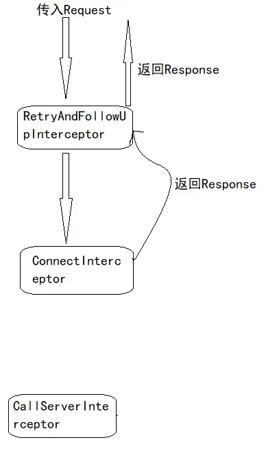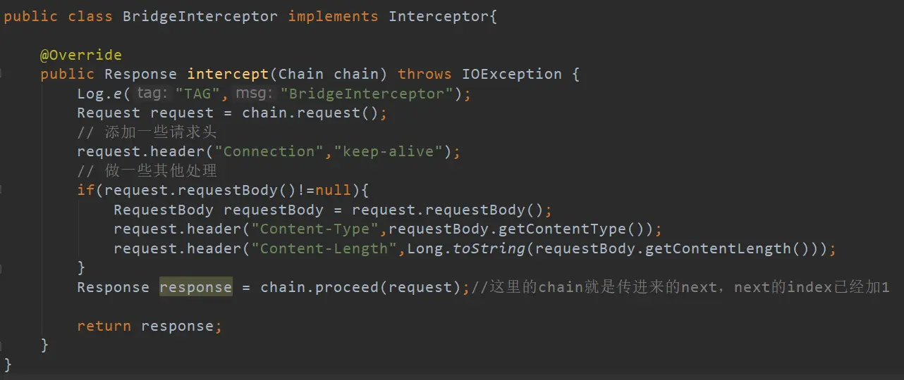 intercept方法如果返回realChain.proceed(request, streamAllocation, httpCodec, connection);就将request传递给下个拦截器