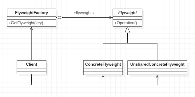 其中,Flyweight是抽象享元角色。它是产品的抽象类,同时定义出对象的外部状态和内部状态(外部状态及内部状态相关内容见后方)的接口或实现;ConcreteFlyweight是具体享元角色,是具体的产品类,实现抽象角色定义的业务;UnsharedConcreteFlyweight是不可共享的享元角色,一般不会出现在享元工厂中;FlyweightFactory是享元工厂,它用于构造一个池容器,同时提供从池中获得对象的方法。
