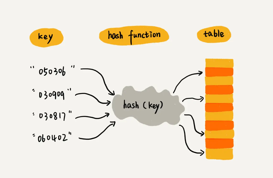 我们通过散列函数把元素的键值映射为下标,然后将数据存储在数组中对应下标的位置。当我们按照键值查询元素时,我们用同样的散列函数,将键值转化数组下标,从对应的数组下标的位置取数据。
