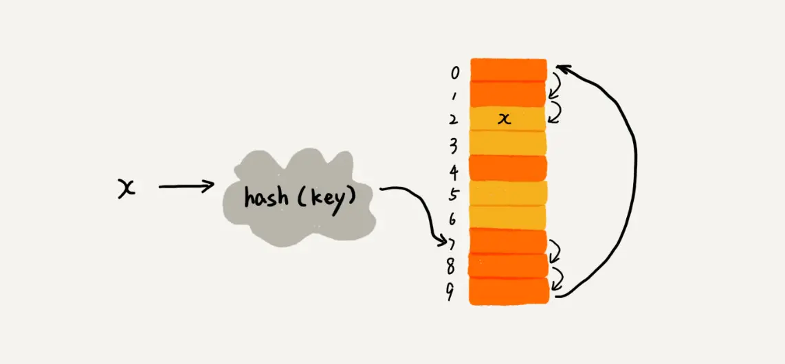从图中可以看出,散列表的大小为 10,在元素 x 插入散列表之前,已经 6 个元素插入到散列表中。x 经过 Hash 算法之后,被散列到位置下标为 7 的位置,但是这个位置已经有数据了,所以就产生了冲突。于是我们就顺序地往后一个一个找,看有没有空闲的位置,遍历到尾部都没有找到空闲的位置,于是我们再从表头开始找,直到找到空闲位置 2,于是将其插入到这个位置。