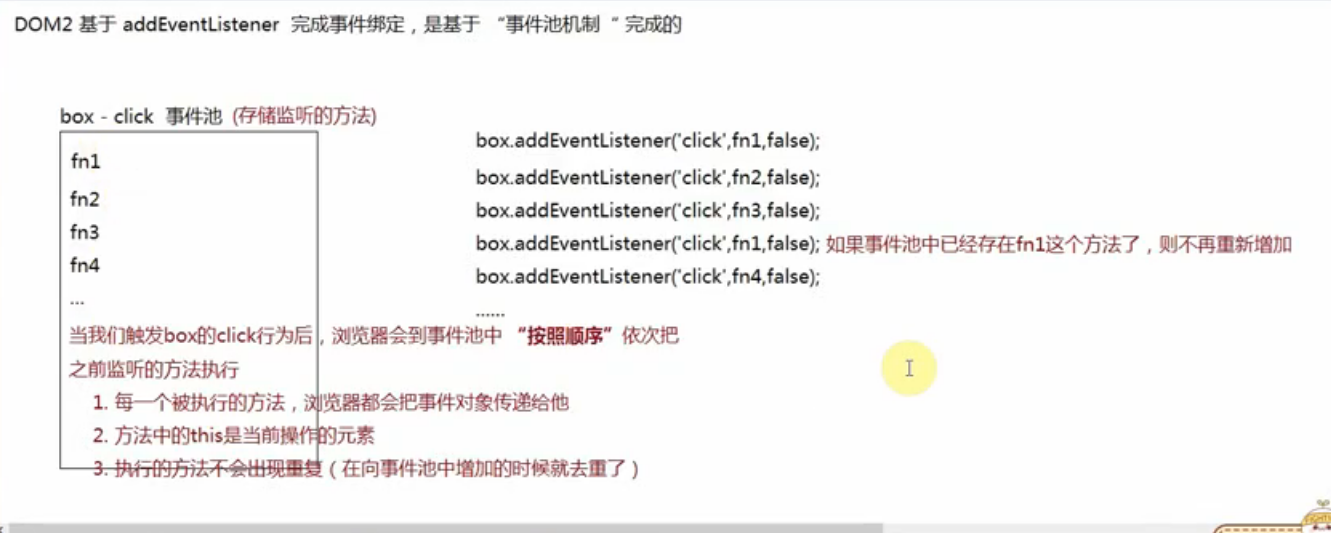 首先在事件未执行前,会把box的click的所有方法添加到一个数组里面(即添加到事件池里面),此时数组中有[fn1,fn3,fn5,fn7,fn9,fn2,fn4,fn6,fn8,fn10]