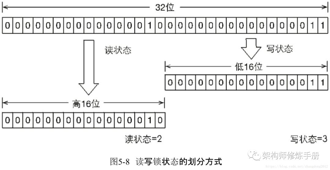 该读写锁的实现原理是:将同步变量state按照高16位和低16位进行拆分,高16位表示读锁,低16位表示写锁。