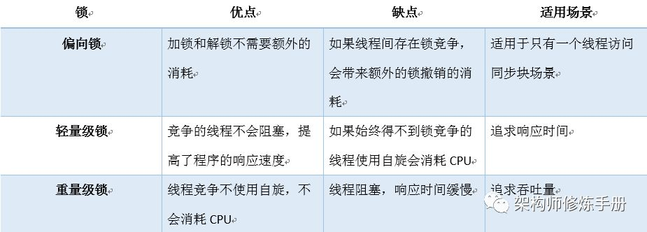 锁可以升级但不能降级,意味着偏向锁升级成轻量级锁后不能降级成偏向锁。这种锁升级却不能降级的策略,目的是为了提高获得锁和释放锁的效率。