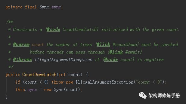 即,传入一个初始值count来确定有多少个任务(入参不得小于0,否则会抛出异常),该值存于AbstractQueuedSynchronizer类里(AQS,在《【并发编程】一文详解Java中的各种锁》中有介绍),声明为volatile,即对内存可见,保证多线程下该值同时只能被一个线程修改(关于volatile参考《【并发编程】揭开volatile的神秘面纱》),每当执行完一个任务,count减1,直到为0,所有任务执行完毕。