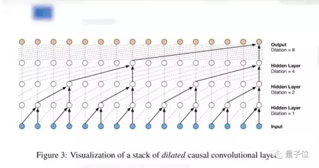 其次,每个残差层均包含一个随着核心尺寸增加而增加的扩张卷积、一个非线性单元RELU,还有一个1×1 卷积,固定宽度为128个通道。