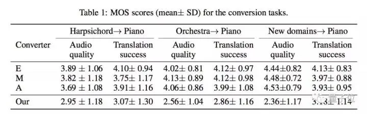 研究人员记录了改编过音频的MOS分数(平均评价计分),结果显示,模型显示的音频质量略低于人类演奏的音频质量。