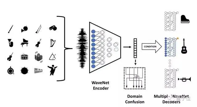 这是一种横跨乐器、流派和风格的音乐转换方法,在多域Wavenet自编码器的基础上改造而来。这是此前谷歌研究出的一种原始音频波形生成模型,波形生成速度快,并且效果逼真。
