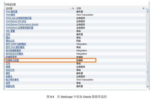 根据SiteScope 帮助文档,需要把oracle 的jdbc 驱动classes12.zip 放到 directory>\Web-INF\lib 和 \java\lib\ext,之后重启SiteScope 才能对Oracle 进行监控。添加监控器时,选择“数据库计数器”选项,如图8.9 所示,然后配置Oracle的JDBC 连接即可。