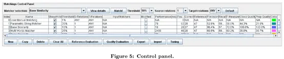 源和目标本体(在XML,RDFS,OWL或N3中)使用熟悉的大纲树范例并排显示(参见图4)。匹配结果可以以不同的格式导出(例如,XML,Excel)。由于所有匹配操作及其结果均由此接口管理,因此我们特别考虑了其设计[4]。我们将介绍接口的下两个新功能:控制面板和非分层结构的可视化(例如,由于OWL中的多重继承)。后一特征允许在视觉上复制特定的子树。因为我们采用模型-视图-控制模式,所以这种应用不会影响基础数据结构。控制面板(参见图5)允许用户运行和管理匹配方法及其结果。用户可以选择所有方法共有的参数(例如阈值和基数)和特定于方法的参数。当一个方法运行时,一个新行被动态地添加到作为控制面板一部分的表中,同时添加了描述概念之间映射的行(参见图4)。每行都是彩色编码的,并允许其选择,以便可以在视觉上比较相应的映射(相同颜色)。每行还显示相关方法的性能值,从而允许与其他行的性能值进行比较。此外,用户可以在运行时通过直接更改表中的值或通过选择先前计算的匹配结果作为下一个要应用的方法的输入来修改这个方法的参数。多个匹配也可以手动组合或与自动组合匹配器组合。