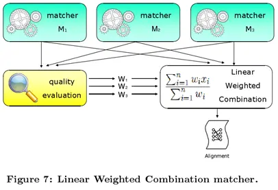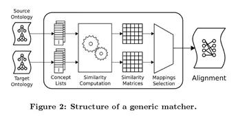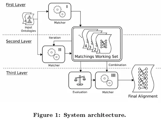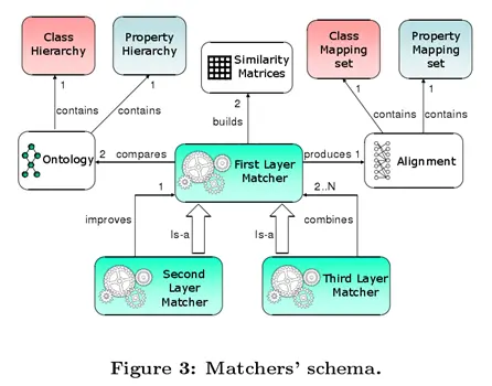 第一层匹配器产生相似性矩阵,而第二和第三层匹配器扩展第一层匹配器。特别地,第二层匹配器使用概念或结构信息改进第一层匹配器的结果,这取决于它是单独考虑一个概念还是概念及其邻居。最后,第三层匹配器组合来自先前层的两个或更多个匹配器的结果,以便获得最终匹配或对齐,即一组映射。