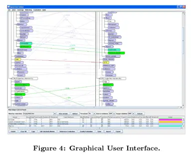 The source and target ontologies (in XML, RDFS, OWL, or N3) are visualized side by side using the familiar outline tree paradigm (see Figure 4). Agreements can be exported in different formats (e.g., XML, Excel). Because all the matching operations and their results are managed by this interface, we gave special consideration to its design [4]. We describe next two new features of the interface: the control panel and the visualization of non-hierarchical ontologies (e.g., due to multiple inheritance in OWL). The latter feature allows for specific subtrees to be visually duplicated. Because we adopt the Model-View-Control pattern, this duplication does not affect the underlying data structures. The control panel (see Figure 5) allows users to run and manage matching methods and their results. Users can select parameters common to all methods (such as threshold and cardinality) and method-specific parameters. When a method has run, a new row is dynamically added to the table that is part of the control panel at the same time that lines depicting the mappings between the concepts are added (see Figure 4). Each row is color coded and allows for its selection so that the corresponding mappings (of the same color) can be compared visually. Each row also displays the performance values for the associated methods, thus allowing for the comparison with those of other rows. In addition, users can modify at runtime the method parameters by changing directly their values in the table or by selecting previously calculated matchings as input to the methods to be applied next. Multiple matchings can also be combined manually or with an automatic combination matcher.