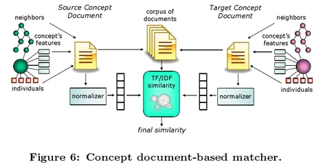 First layer matchers compare concept features (e.g., label, comments, annotations, and instances) and use a variety of methods including syntactic and lexical comparison algorithms as well as the use of a lexicon like Word Net. Of those methods some were proposed by others (e.g., edit distance, Jaro-Winkler) and some devised by us, including a substring-based comparison that favors the length of the common substrings and a concept document-based comparison containing a wide range of features. Those features are represented as TF-IDF vectors and use a cosine similarity metric (see Figure 6).