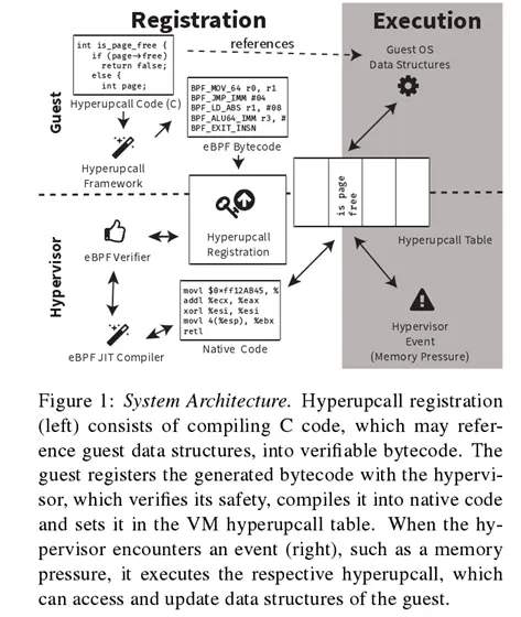 Hyperupcalls是由guest虚拟机提供给Hypervisor的简短可验证程序,用于提高性能或提供其他功能。 guest虚拟机通过启动时的注册过程向Hypervisor提供hyperupcall,允许Hypervisor访问guest虚拟机操作系统状态,并在验证后通过执行它们来提供服务。 Hypervisor运行hyperupcalls以响应事件或何时需要查询guest状态。 hyperupcalls的体系结构和我们为利用它们而构建的系统如图1所示。
