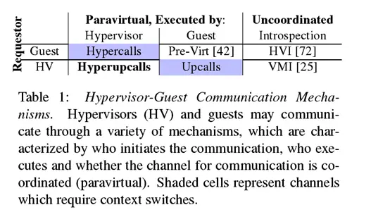 现在人们普遍认为,为了从虚拟化中提取最大的性能和实用性,Hypervisor及其Guest需要彼此了解。 为此,存在许多促进Hypervisor和Guest之间通信的机制。 表1总结了这些机制,这些机制可以由请求者,执行者以及机制是否要求Hypervisor和Guest提前协调来广泛地表征。