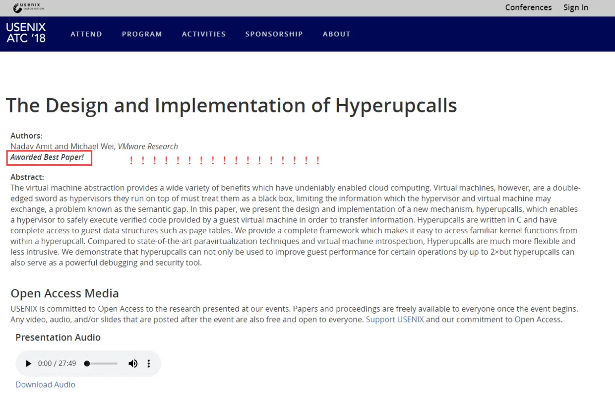 引用如下:Amit N, Wei M. The design and implementation of hyperupcalls[C]//2018 {USENIX} Annual Technical Conference ({USENIX}{ATC} 18). 2018: 97-112.