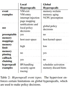 Guest操作系统开发人员为他们希望处理的每个Hypervisor事件编写hyperupcall。 Hypervisor和Guest同意这些事件,例如VM进入/退出,页面映射或虚拟CPU(VCPU)抢占。 每个hyperupcall都由预定义的标识符标识,非常类似于UNIX系统调用接口[56]。 表2给出了hyperupcall可以处理的事件的示例。