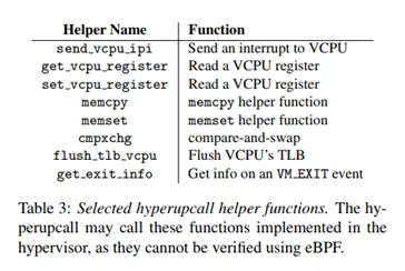 辅助功能安全。 Hyperupcalls可以调用辅助函数来提高性能并帮助限制运行时指令的数量。 辅助函数是标准的eBPF特性,验证者强制执行可以调用的辅助函数,这些函数可能因事件而异,具体取决于Hypervisor策略。 例如,Hypervisor可能在内存回收期间不允许使用flush_tlb_vcpu,因为它可能会阻塞系统一段延长的时间。
