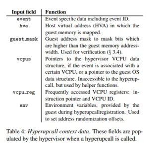 Hyperupcall接口。 当Hypervisor调用hyperupcall时,它会填充一个上下文数据结构,如表4所示. hyperupupall接收一个事件数据结构,它指示调用回调的原因,以及一个指向guest虚拟机的指针(在Hypervisor的地址空间中,正在执行hyperupcall)。 当hyperupcall完成时,它可以返回一个值,该值可以由Hypervisor使用。