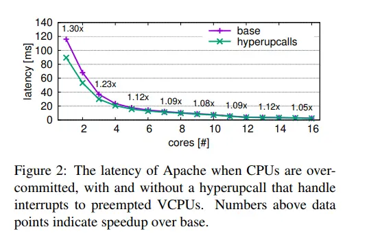 评估。我们使用默认的mpm_event模块在guest虚拟机中运行Apache Web服务器[23],该模块运行多线程工作程序来处理传入的请求。为了衡量性能,我们使用ApacheBench,Apache HTTP服务器基准测试工具,使用16个连接生成10k请求,并测量请求延迟。结果显示在图2中,显示hyperupcalls将延迟减少了1.3 x。即使物理CPU没有超额订阅,性能也会提高,这似乎令人惊讶。但是,由于VCPU在此基准测试中通常暂时处于空闲状态,因此它们也可以触发对Hypervisor的退出。