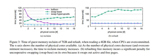 检查是否可以丢弃页面必须通过全局超级调用来完成,因为必须在有限且短时间内提供答案。结果,guest虚拟机只能注册其部分内存以供hyperupcall使用,因为该内存从不被分页以确保及时执行hyperupcall。我们的Linux guest虚拟机注册了页面元数据的内存 约占Guest物理内存的1.6%。评价。为了评估“内存丢弃”hyperupcall的性能,我们测量其对因内存压力而被回收内存的guest虚拟机的影响。当内存不足时,Hypervisor可以执行“不合作的交换” - 直接回收Guest机内存并将其交换到磁盘。然而,这种方法通常会导致次优的回收决策。或者,Hypervisor可以使用memory ballooning,这是一种半虚拟机制,其中Guest模块被告知主机内存压力并导致Guest直接回收内存[71]。然后Guest可以做出知识渊博的回收决定并丢弃空闲页面。虽然内存膨胀通常表现良好,但是当内存需要突然回收时性能会受到影响[4,6]或当Guest盘设置在网络附加存储[68]上时,因此不在高内存压力下使用[21]。