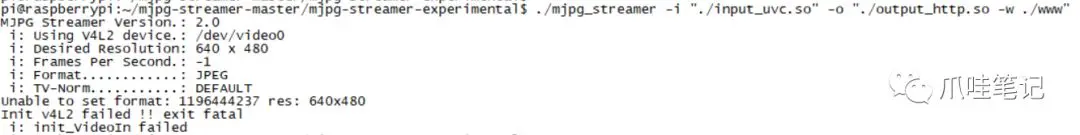 sudo mjpg_streamer -i "./input_uvc.so -r 640x480 -f 10 -n" -o "./output_http.so -p 8080 --w ./www"