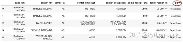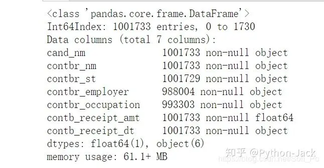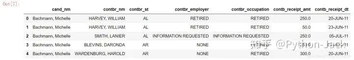 字段解释:cand_nm :候选人姓名contbr_nm : 捐赠人姓名contbr_st :捐赠人所在州contbr_employer : 捐赠人所在公司contbr_occupation : 捐赠人职业contb_receipt_amt :捐赠数额(美元)contb_receipt_dt : 捐款的日期