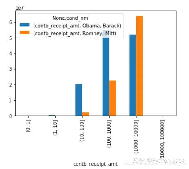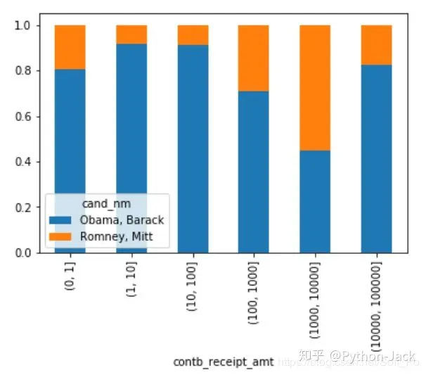 上图虽然能够大概看出Obama、Romney的赞助金额区间分布,但对比并不够突出,如果用百分比堆积图效果会更好,下面我们就实现以下