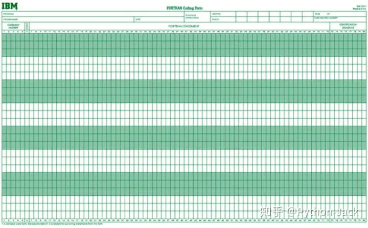 在计算机诞生之初没有操作系统的年代,人们先把程序纸带(或卡片)装上计算机,然后启动输入机把程序和送入计算机,接着通过控制台开关启动程序运行。当程序执行完毕,打印机输出计算的结果,用户卸下并取走纸带(或卡片)。第二个用户上机,重复同样的步骤。在整个过程中用户独占机器,CPU等待手工操作,资源利用率极低。下图是IBM生产的书写Fortran程序的80栏打孔卡,当然这个已经是比较先进的打孔卡了。