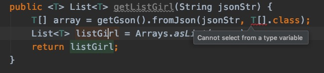 public <T> List<T> getListGirl(String jsonStr) { Type type = new TypeToken<List<T>>(){}.getType(); List<T> listGirl = new Gson().fromJson(jsonStr, type); return listGirl;} |