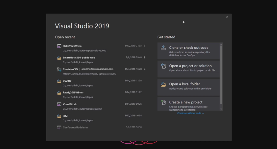打开 Visual Studio 2019 时,你会注意到它是一个新的启动窗口。