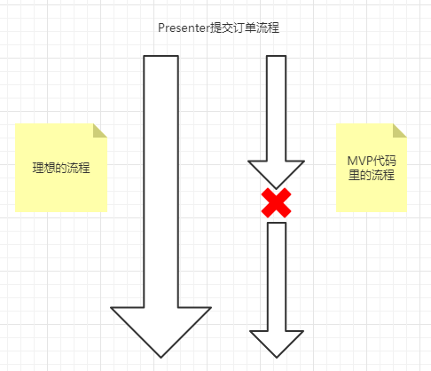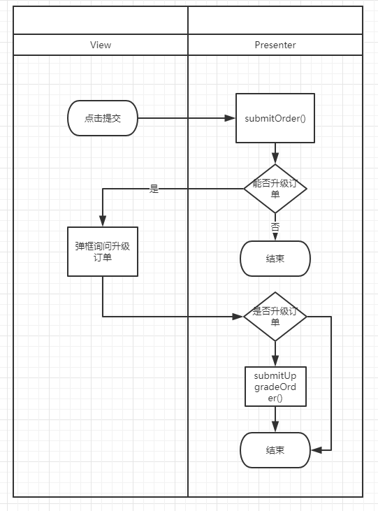 - 逻辑泄露。在Presenter的视角来看,提交订单的一系列流程并不是Presenter自己可知可控的,虽然submitUpgradeOrder() 是提交订单流程的一步,但是Presenter自己完全不知道什么时候会被触发,submitUpgradeOrder()的触发逻辑被把握在View手里,View把握了业务逻辑!