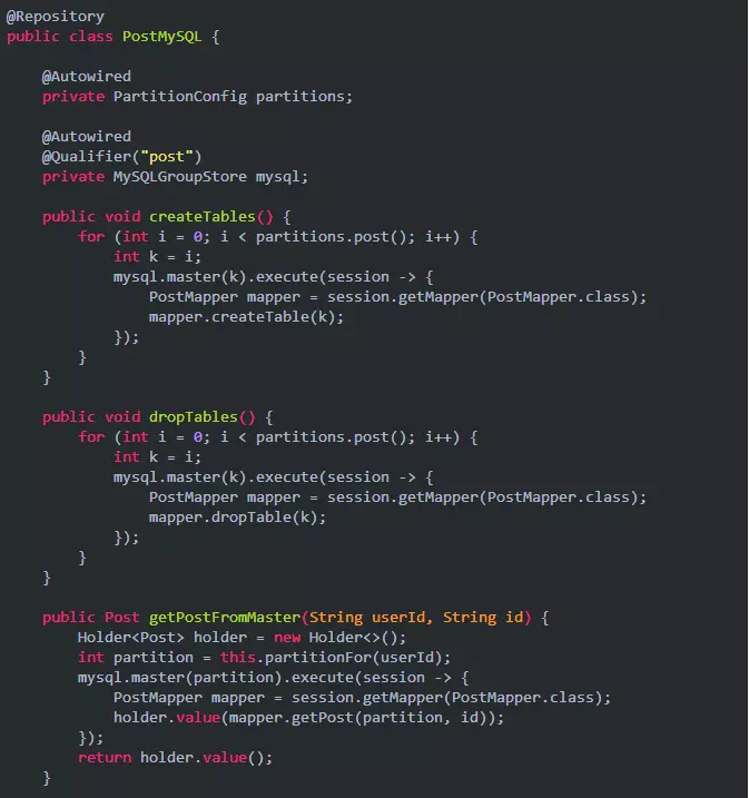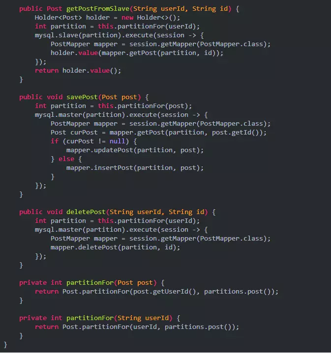 post_k 这张表后缀 k 我们称之为 partition number,也就是后续代码中到处在用的 partition 变量,表明当前的记录被分配到对应物理数据表的序号。我们需要根据记录的内容计算出 partition number,再根据 partition number 决定出这条记录所在的物理表属于那个物理数据库,然后对这个物理数据库进行相应的读写操作。