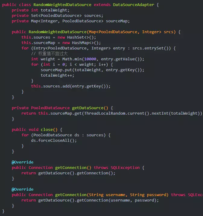 还有最后一个问题是多个带权重的从库是如何做到概率分配的。这里就要使用到 spring-jdbc 自带的 AbstractRoutingDataSource —— 带路由功能的数据源。它可以包含多个子数据源,然后根据一定的策略算法动态挑选出一个数据源来,这里就是使用权重随机。