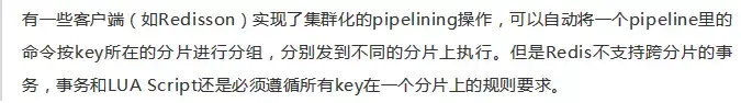使用Redis Cluster时,pipelining、事务和LUA Script功能涉及的key必须在同一个数据分片上,否则将会返回错误。如要在Redis Cluster中使用上述功能,就必须通过hash tags来确保一个pipeline或一个事务中操作的所有key都位于同一个Slot中。