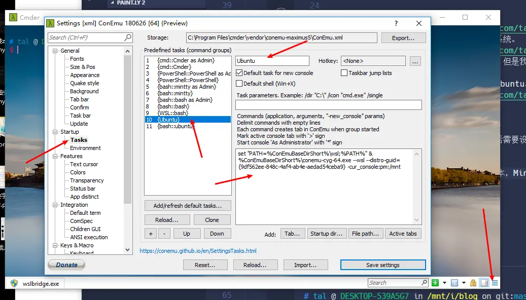 set "PATH=%ConEmuBaseDirShort%\wsl;%PATH%" & %ConEmuBaseDirShort%\conemu-cyg-64.exe --wsl --distro-guid={9df562ee-848c-4af4-ab4e-aedad54ceba9} -cur_console:pm:/mnt。这里面的9df562ee-848c-4af4-ab4e-aedad54ceba9指的是Ubuntu的唯一标识符,如果重装了子系统,那么这个标识符实惠变得。可以在在注册表(regedit)中查找计算机\HKEY_CURRENT_USER\Software\Microsoft\Windows\CurrentVersion\Lxss。win+R搜索regedit。