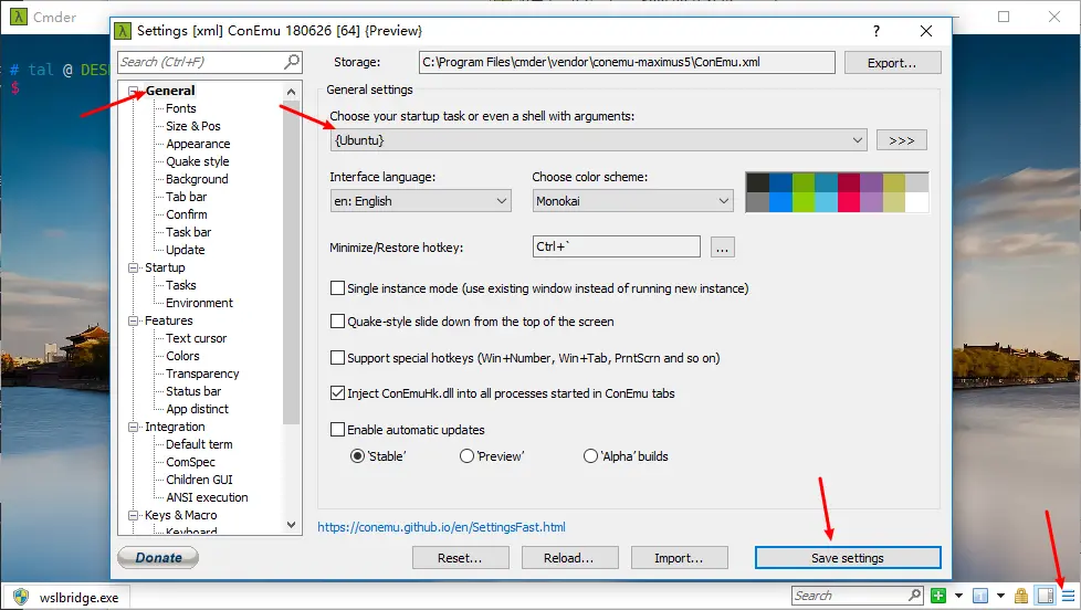 cmder有两个版本,Mini版与完整版(包含了git以及一些其他的命令)。推荐安装完整版。 安装完成后打开,我们需要进行配置一下