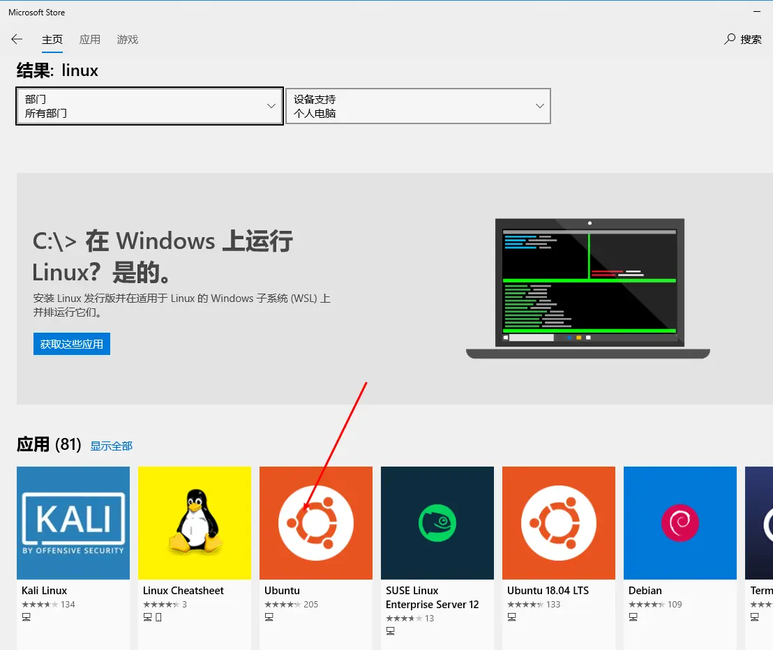 我们在win10应用商店里面搜索linux,安装Ubuntu。